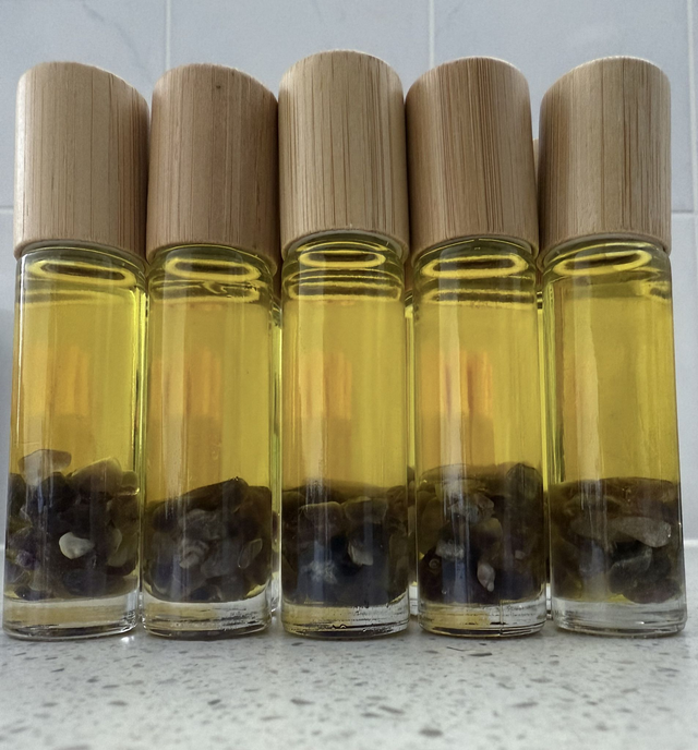 Also contains Amethyst crystal chips, infuse the oil with the benefits of this beautiful crystal, Amethyst is said to work on the same frequency as sleep. The rollerball is also Amethyst.