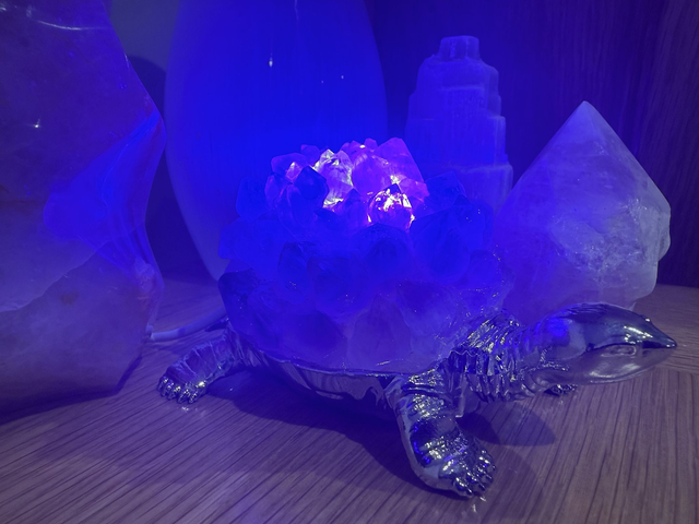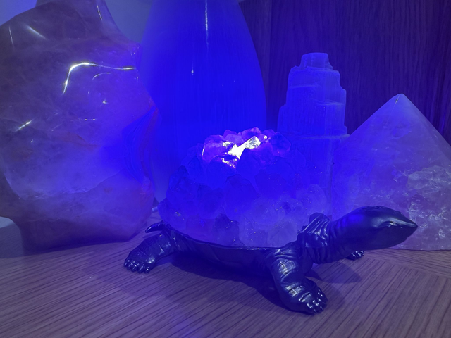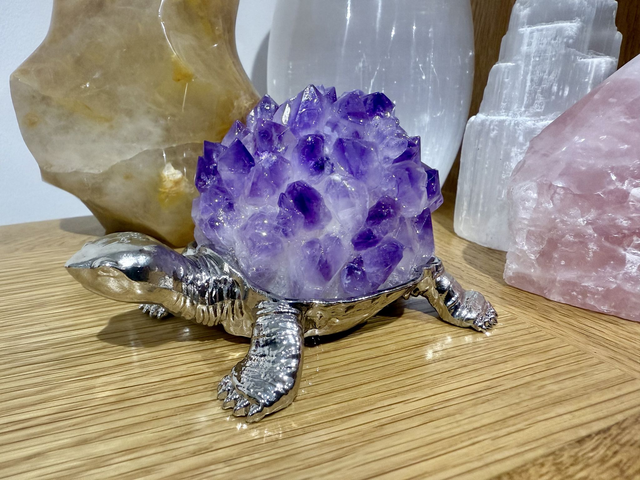 The Amethyst Crystal Turtle LED Light is a decorative, handcrafted lamp featuring genuine Amethyst crystals in a turtle design, it emits a calming, soothing glow. It is designed as a unique accent piece for home decor.