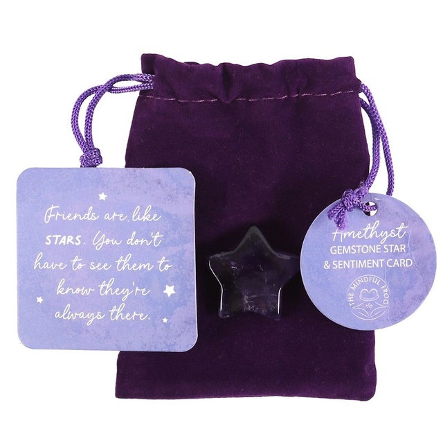 Promote clarity, protection and the cleansing of negative energies with this lucky amethyst crystal star. Presented in a purple velvet drawstring bag, this charm makes a meaningful token of inspiration and empowerment for anyone in need of some extra positivity. Includes an informational "Friends are like stars. You don't have to see them to know they're there" sentiment card for easy gifting.