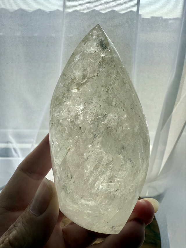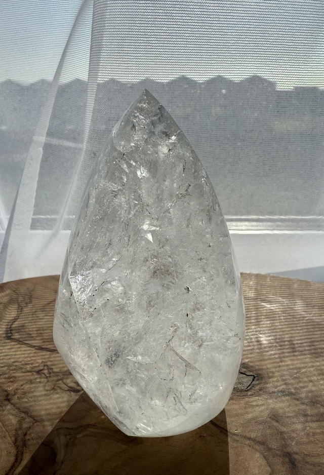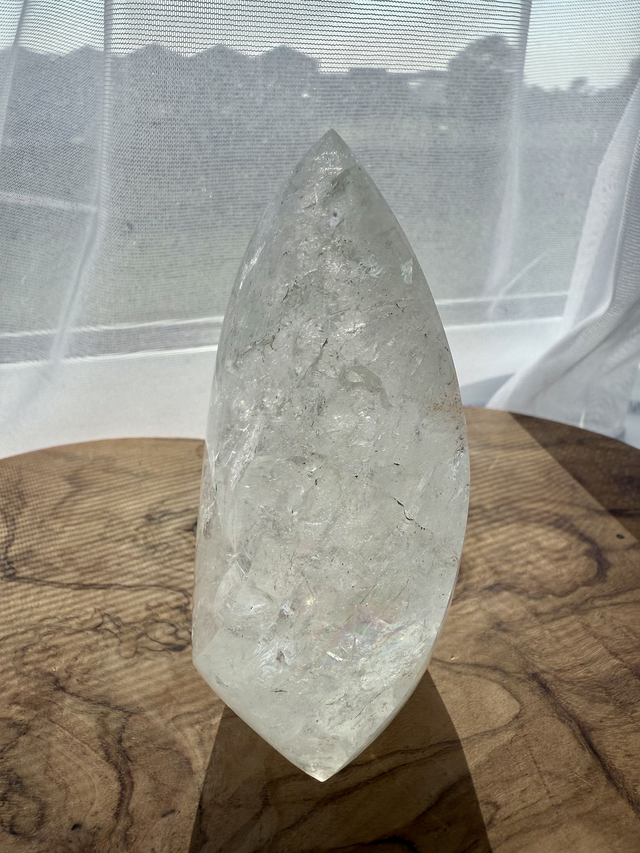 This clear Quartz has been carved and polished into a flame shape, creating a free-standing healing tool that also makes a unique, decorative display piece or a piece that you can work with.
