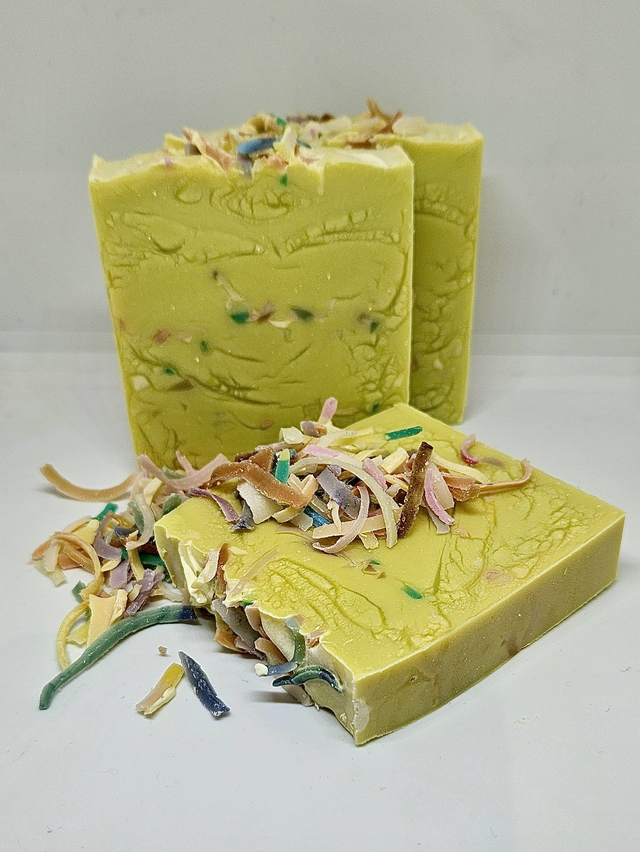 This soap is made from a range of all other soap bar products products by IndiGlowGY, slices of each soap to create a confetti effect.