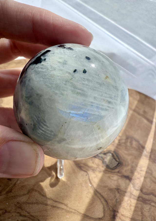 With its pearly glow and subtle flashes of iridescence, each moonstone sphere is unique and captivating.