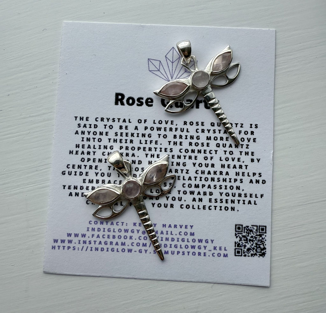 The symbol of transformation and eternal love, this stunning sterling silver dragonfly pendant holds a beautiful, natural Rose Quartz crystal. The finely detailed silver work captures the delicate essence of the dragonfly, while the polished Rose Quartz crystal, known as "the crystal of universal love" adds a touch of serene, gentle colour.