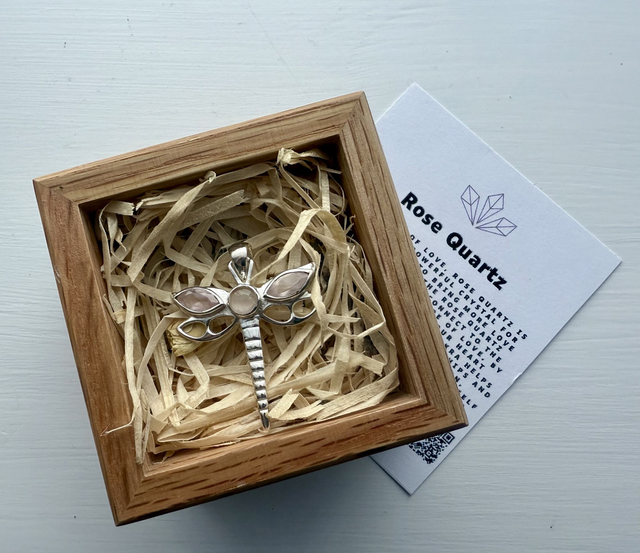The pendant is presented in an exquisitely crafted solid oak gift box. The rich, natural wood finish of the box complements the delicate silver and soft pink tones of the necklace, creating a beautiful contrast. The box provides a protective sanctuary for your jewellery and an elegant presentation that makes for a perfect gift for yourself, partner, loved one, friend or just because.