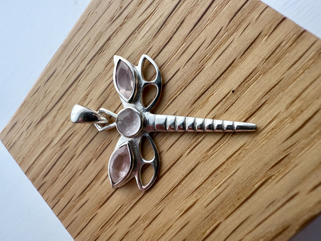 Rose Quartz Crystal Dragonfly Silver Pendant
