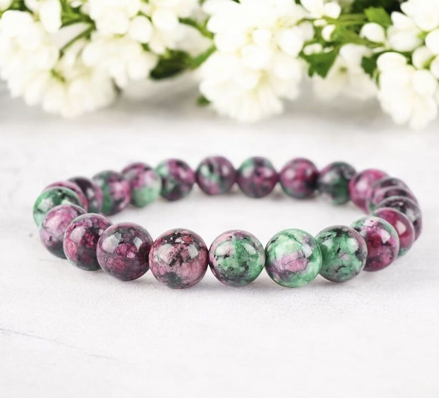 Ruby Zoisite is a stunning fusion of passion and grounding energy. Crafted with precision and care. the captivating combination of ruby and zoisite, renowned for their harmonising properties and captivating beauty. it is said that The deep red hues of ruby infuse the wearer with passion and vitality, while the soothing green tones of zoisite promote inner harmony and tranquility.